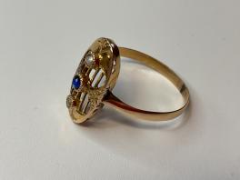 BAGUE CISELE ET AJOURE EN OR JAUNE 18K 750 MILLIEMES DE FORME OVALE SERTIE DE DEUX PETITES PERLES ET D'UN SAPHIR. TDD: 49. REPARATION. POIDS BRUT: 1.3G