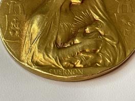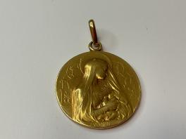 MEDAILLE RELIGIEUSE EN OR JAUNE 18K 750 MILLIEMES. GRAVEUR F. VERNON. POINCON TETE D'AIGLE. DIAMETRE: 2,2 CM. POIDS BRUT: 8.2 G