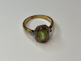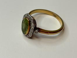 UNE BAGUE EN OR JAUNE 18K 750 MILLIEMES CENTREE D'UN BERYL VERT (?) DANS UN ENTOURAGE DE DIAMANTS TAILLES EN ROSE. POINCON TETE DE CHEVAL. TDD: 52. POIDS BRUT: 3 G
