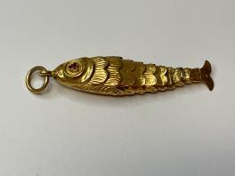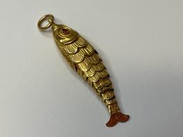 UN PENDENTIF POISSON ARTICULE EN OR JAUNE 18K 750 MILLIEME, LES YEUX EN PIERRES ROUGES. LONGUEUR: 3,5 CM. POINCON TETE D'AIGLE. POIDS BRUT: 1.5 G