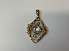 UN PENDENTIF DE FORME OVALE EN OR JAUNE CISELE CENTRE D'UNE AIGUE MARINE DANS UN ENTOURAGE AJOURE A DECOR DE FLEURS. HAUTEUR: 2,5 CM ENVIRON. POIDS BRUT: 2 G