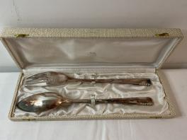 SERIE DE DOUZE GRANDS COUTEAUX DANS ECRIN MANCHE EN CORNE LAME ACIER INOXYDABLE ; COUVERTS A SALADE EN METAL ARGENTE DANS ECRIN "GUILDE DES ORFEVRES" ; COUTEAU EN METAL ARGENTE. L'ENSEMBLE