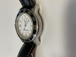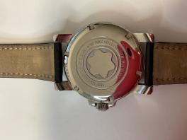MONT BLANC: MONTRE D'HOMME EN ACIER, MODELE MEISTERSTUCK, CADRAN FOND BLANC, LUNETTE NOIRE, GUICHET DATEUR A 3H. REF: 7037-PL 240976. BRACELET CUIR, BOUCLE DEPLOYANTE EN ACIER (USURE SUR BRACELET)